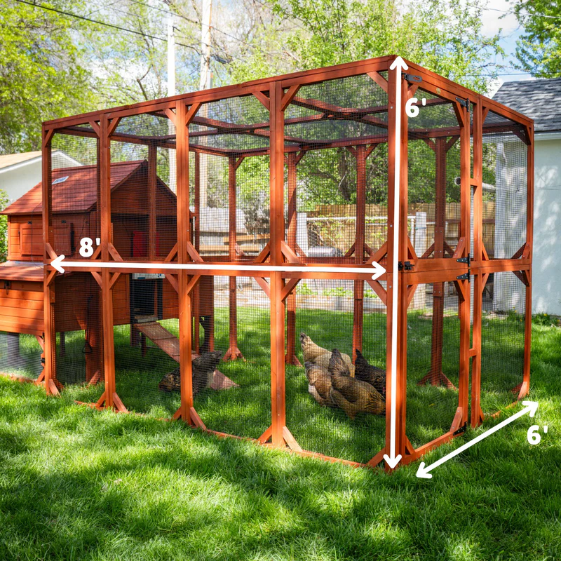 The Brahma Walk-In Run Extension is the answer to providing extra room for you and your flock. No more bending over or crawling into your run. It’s a full 6 feet long, eight feet wide, and six feet tall. A full-panel door on the side and a half-panel door on the end provide easy access to your flock. This run extension was specifically designed for our Rhode Island Homestead Coop, Orpington Coop, and the soon-to-be-introduced Brahma Coop.