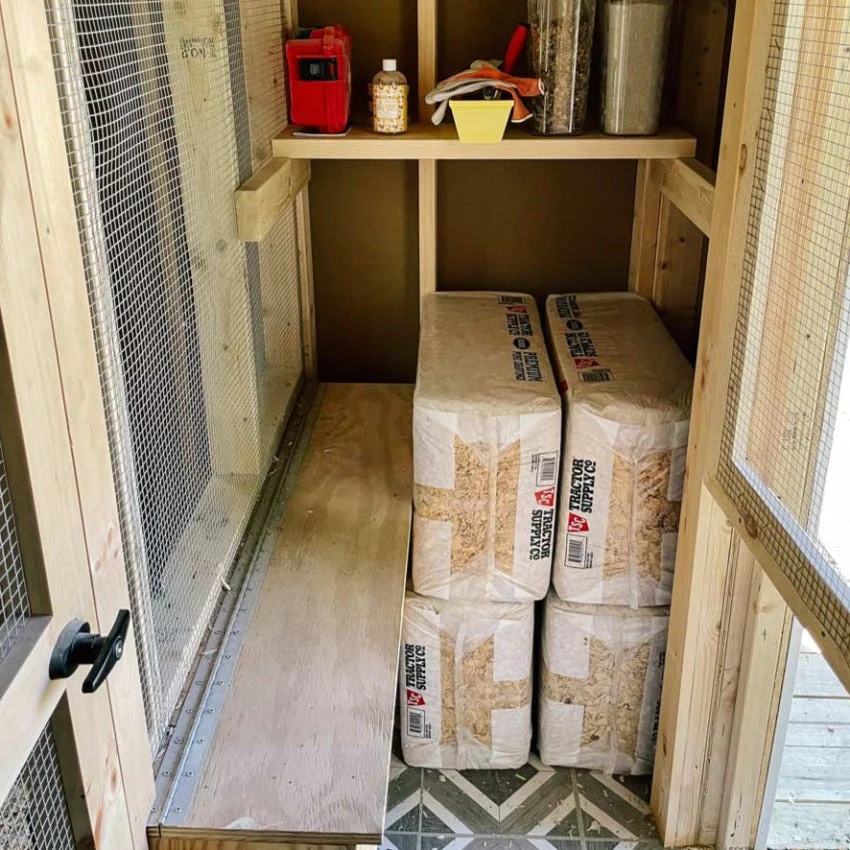 All of our coops have our signature Clean-Out-The-Coop Door™. This 10”x3’ door is an opening by the floor of the coop that allows for easy clean out of the shavings/debris from your coop. Another feature that contributes to cleanliness is our attention to detail, in that owners never have to enter their coop to either gather eggs or open the run.