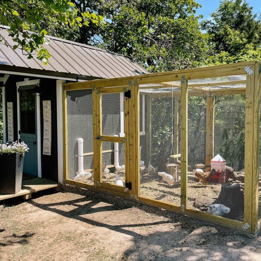 Cutest Coops Runs:  Are made of treated wood & very strong gauge 1/2″ hardware wire to protect your flock!  The top of our runs also has 1/2″ hardware wire.  They are full-size and walk-in style and line up with the bottom of your roofline.  These runs also have a full-size door with a locking handle included.  Although our runs are unpainted, many of our clients elect to paint them after 6-12 months of allowing the sunshine to help dry the wood in order to allow the paint to adhere properly.