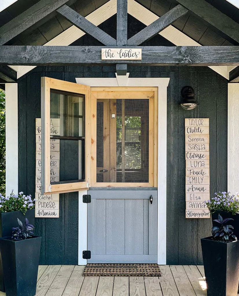 All of our coops are built with chickens and their owners in mind, which is why our coops and runs have a standard height door and are of the interior height that allows for a comfortable standing room. Our sidewalls have a minimum height of 5’, except for The Charming Coop; however, most of our coops’ sidewalls are between 6’-7’, eliminating stress on chicken owners’ backs.