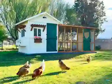 No detail or amenity is spared creating The Farmhouse Coop! Designed to be the perfect mix between traditional and modern farmhouse style, this spacious 7’x7′ coop and 7’x12′ run features 4 exterior reach-in nesting boxes, 2 barn style Dutch doors, operable glass windows, over 10′ of roosting bar space, dust bath, solar barn lamps and decorative features that will make this coop the highlight of your backyard!